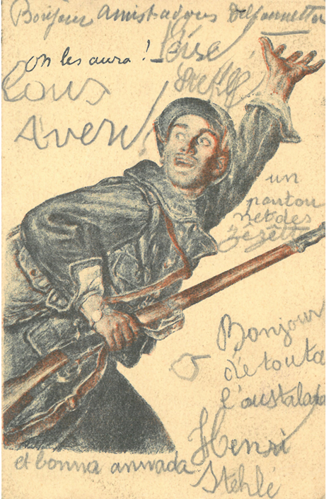 Son titre: “On les aura” reprend une phrase du Maréchal Pétain prononcée au plus fort de la bataille de Verdun . Sous titrée à la main “Lous Aven” et adressée par Louis Stelhé et sa famille depuis Ganges à Pierre Azéma de Montpellier, le 1er janvier 1919 elle comporte plusieurs annotations manuscrites en occitan, rédigées par chacun des membres de la famille.
