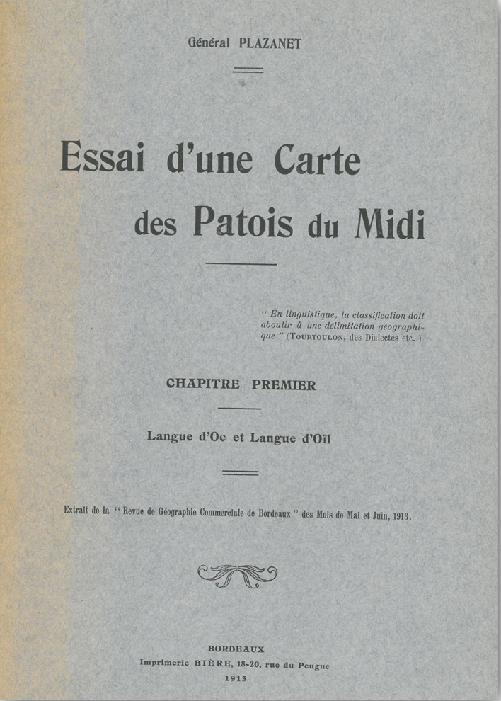 Général Plazanet, Essai d’une carte des patois du Midi, Bordeaux, impr. Bière : 1913.